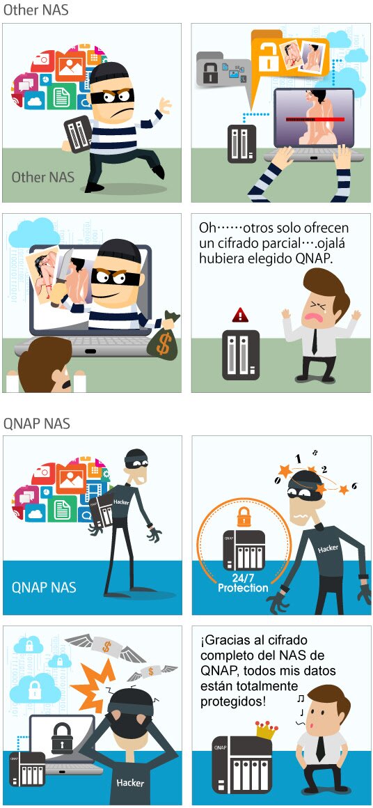 En un servidor NAS normal o en dispositivos QNAP que no tengan el nuevo firmware QTS 4.1.1, es bastante “sencillo” tener acceso a los datos de los usuarios del servidor si el equipo está en un red poco segura o el equipo ha sido robado. Con el nuevo firmware QTS 4.1.1, ésto es mucho más difícil. A partir de ahora absolutamente todos los datos que estén almacenados en el servidor serán cifrados, y con un cifrado verdaderamente bueno.